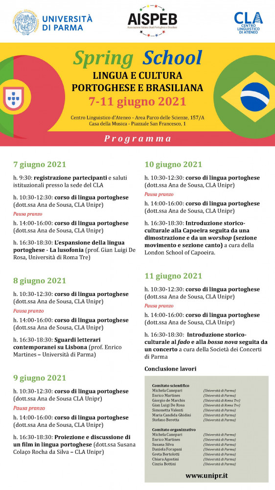 Come riporta la locandina, tra il 7 e l’11 giugno 2021 si è svolta - con il patrocinio dell'AISPEB (Associazione Italiana di Studi Portoghesi e Brasiliani) la Spring School di lingua e cultura portoghese e brasiliana, che si è tenuta nei locali del Centro Linguistico di Ateneo (CLA), all’interno del Campus universitario. L’obiettivo di quest’iniziativa era la promozione della lingua e della cultura portoghese e brasiliana, offrendo la possibilità agli iscritti – studenti, insegnanti, personale universitario e non solo – di compiere una vera e propria full-immersion in questi ambiti di studio, così ricchi e variegati. Inoltre, un elemento fondamentale di questo corso, sul quale il CLA ha insistito spostando appositamente la data inizialmente prevista, era il suo svolgimento in presenza, il suo carattere partecipativo, essenziale non solo all’apprendimento linguistico ma anche ai fini del recupero di una dimensione da troppo tempo negata dagli effetti della pandemia, ossia, il piacere di stare insieme, di imparare attraverso lo scambio interpersonale diretto.